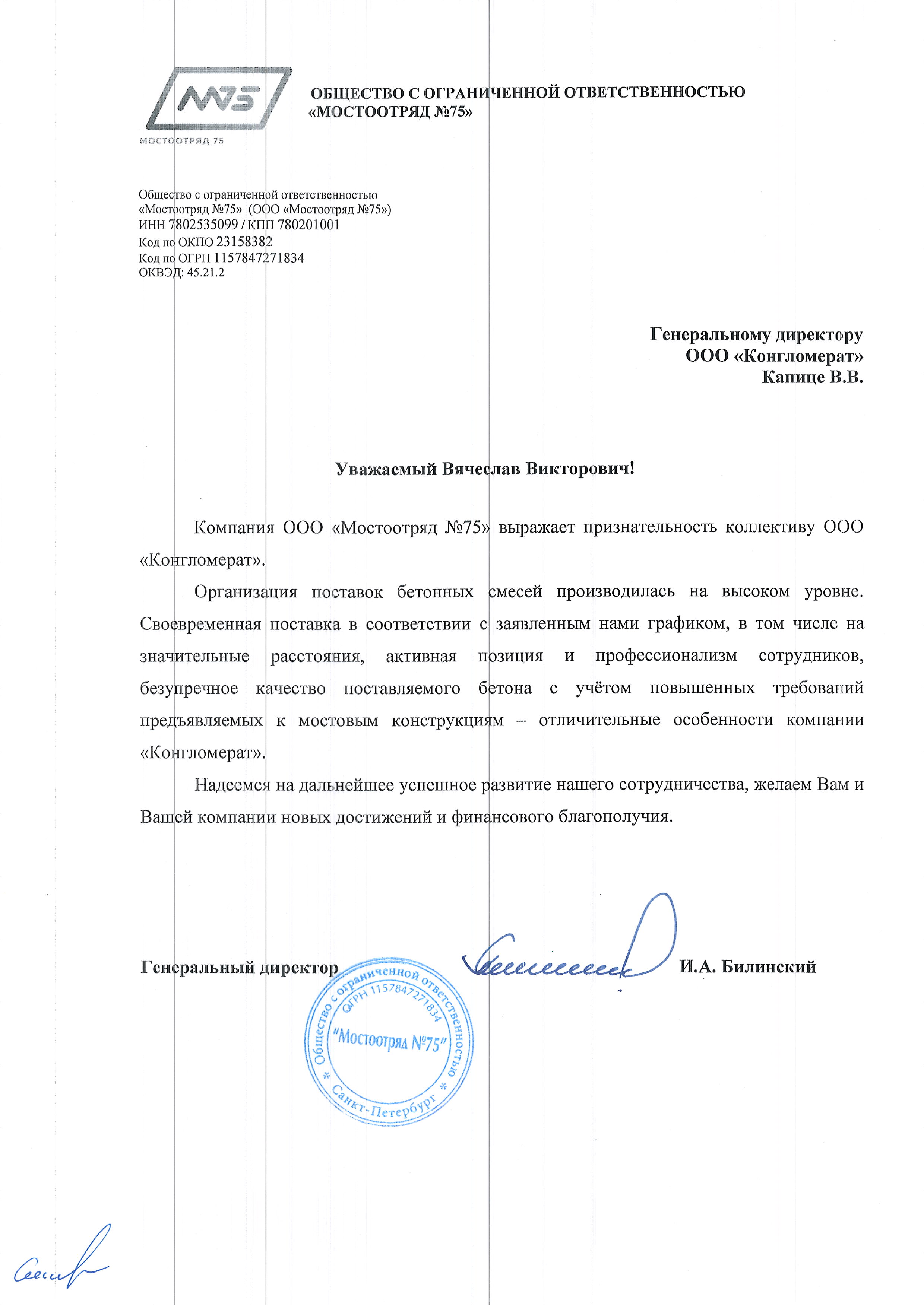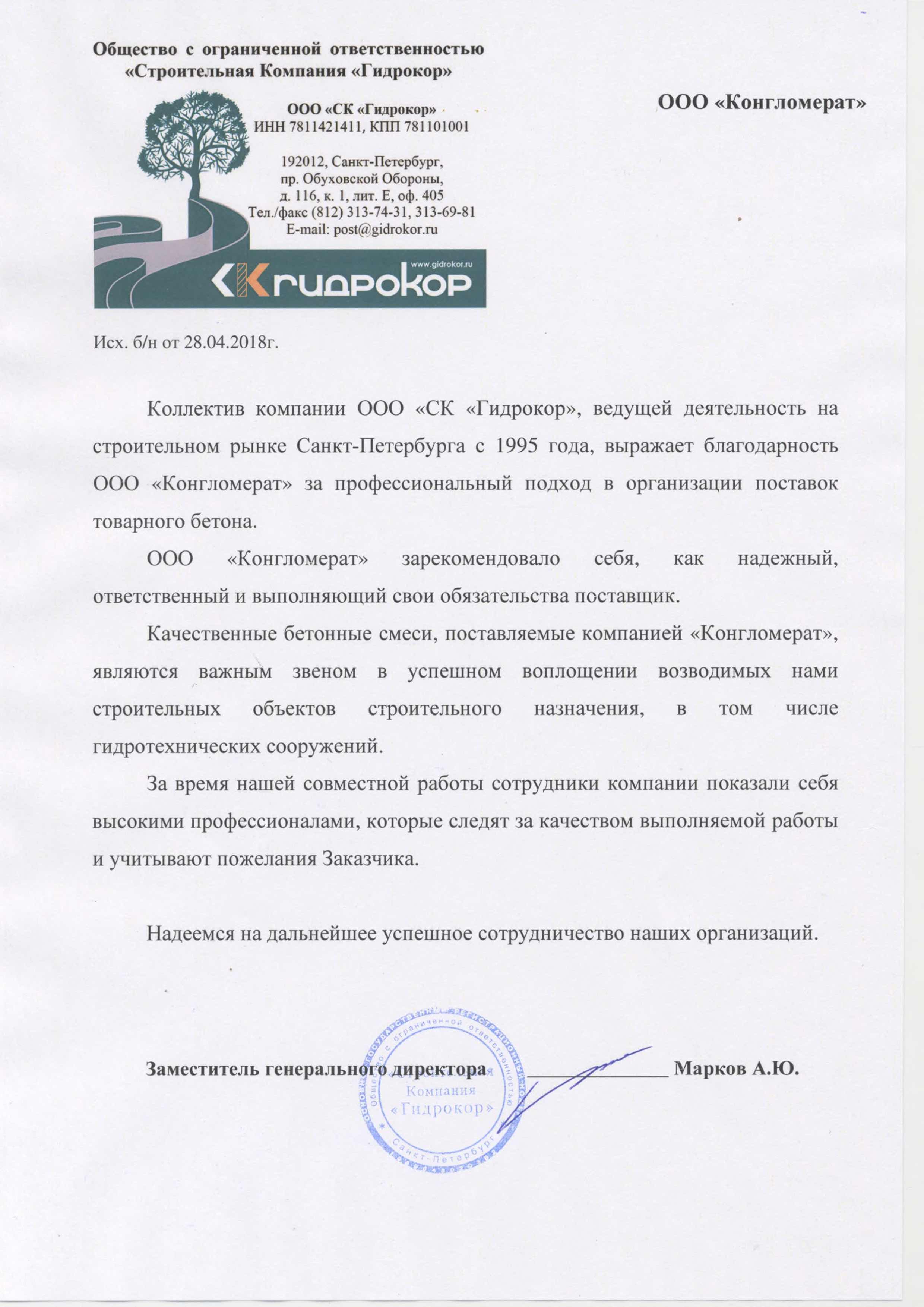 Наша компания осуществляет строительную деятельность с 2010 года, выполняя работы по бетонированию и монтажу сборных железобетонных конструкций и т.д. на таких объектах, как ЖК «Финские кварталы», ЖК «Янила Кантри» и т.д. Поэтому и наши требования к компании-производителю бетона являются повышенными. Помимо обеспечения должного качества бетонных смесей, для нас также важнейшими показателями являются: отсутствие расхождения между автобетоносмесителями, что нередко встречается среди бетонщиков; налаженная работа диспетчерской службы поставщика; профессиональная лаборатория; своевременный документооборот; внимательное отношение к клиенту. Именно таким партнером стал для нас бетонный завод «Конгломерат». Несколько лет нашего непрерывного сотрудничества показали нам, что данная компания полностью соответствует критериям, указанным выше. Рекомендуем и Вам при выборе поставщика бетонных и растворных смесей обратить внимание на профессиональный и дружный коллектив компании ООО «Конгломерат»!
